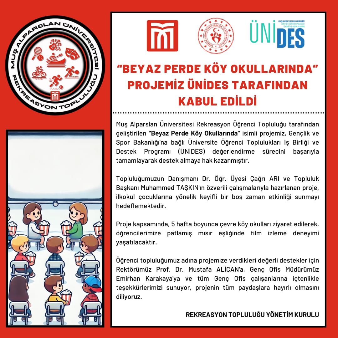 Fakültemiz Rekreasyon Öğrenci Topluluğu tarafından geliştirilen "Beyaz Perde Köy Okullarında" isimli projemiz ÜNİDES tarafından desteklenmeye hak kazanmıştır.